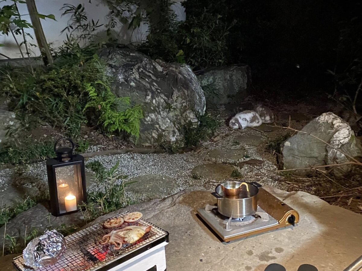 食事のそばには、いつの間にか野生のウサギたちがやってきて、