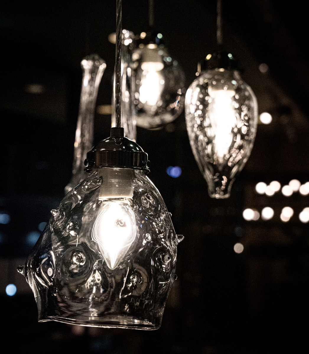照明やオブジェや花器など、すべて吹きガラスの一点ものです。