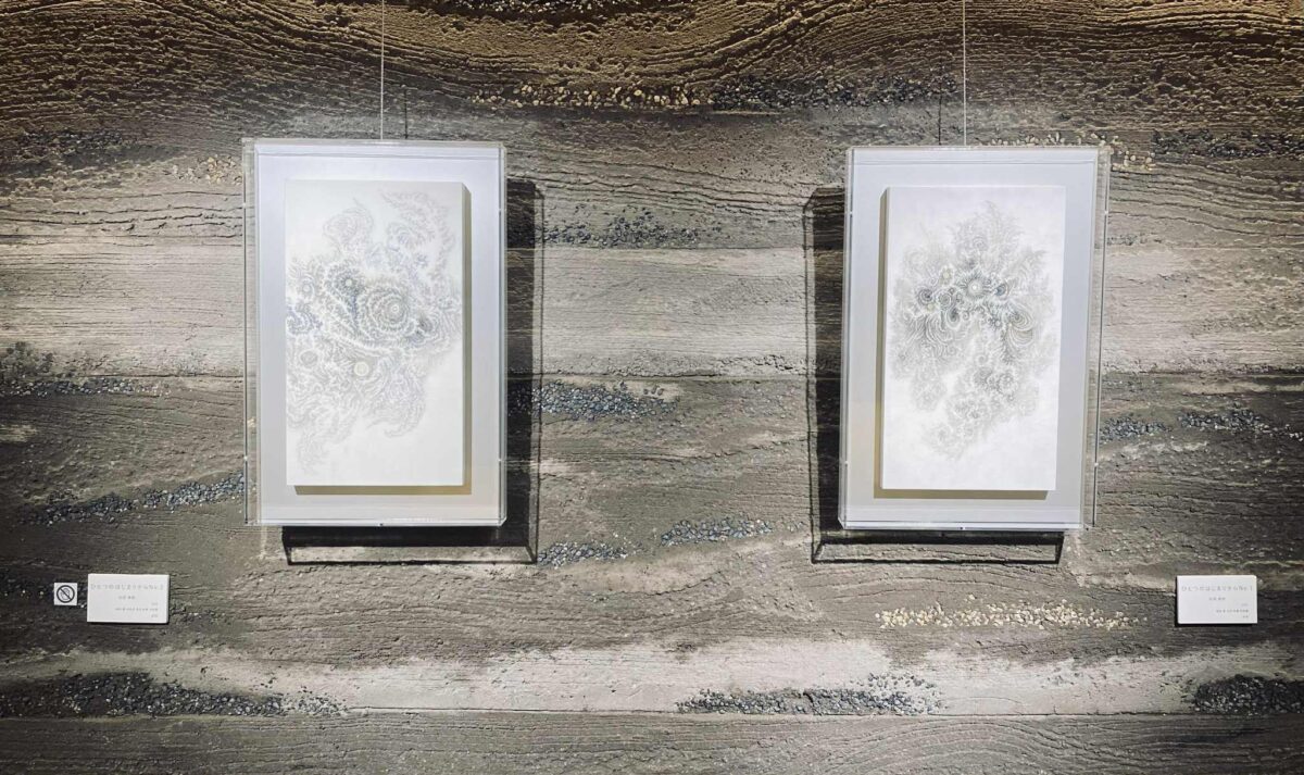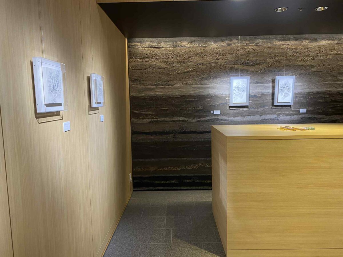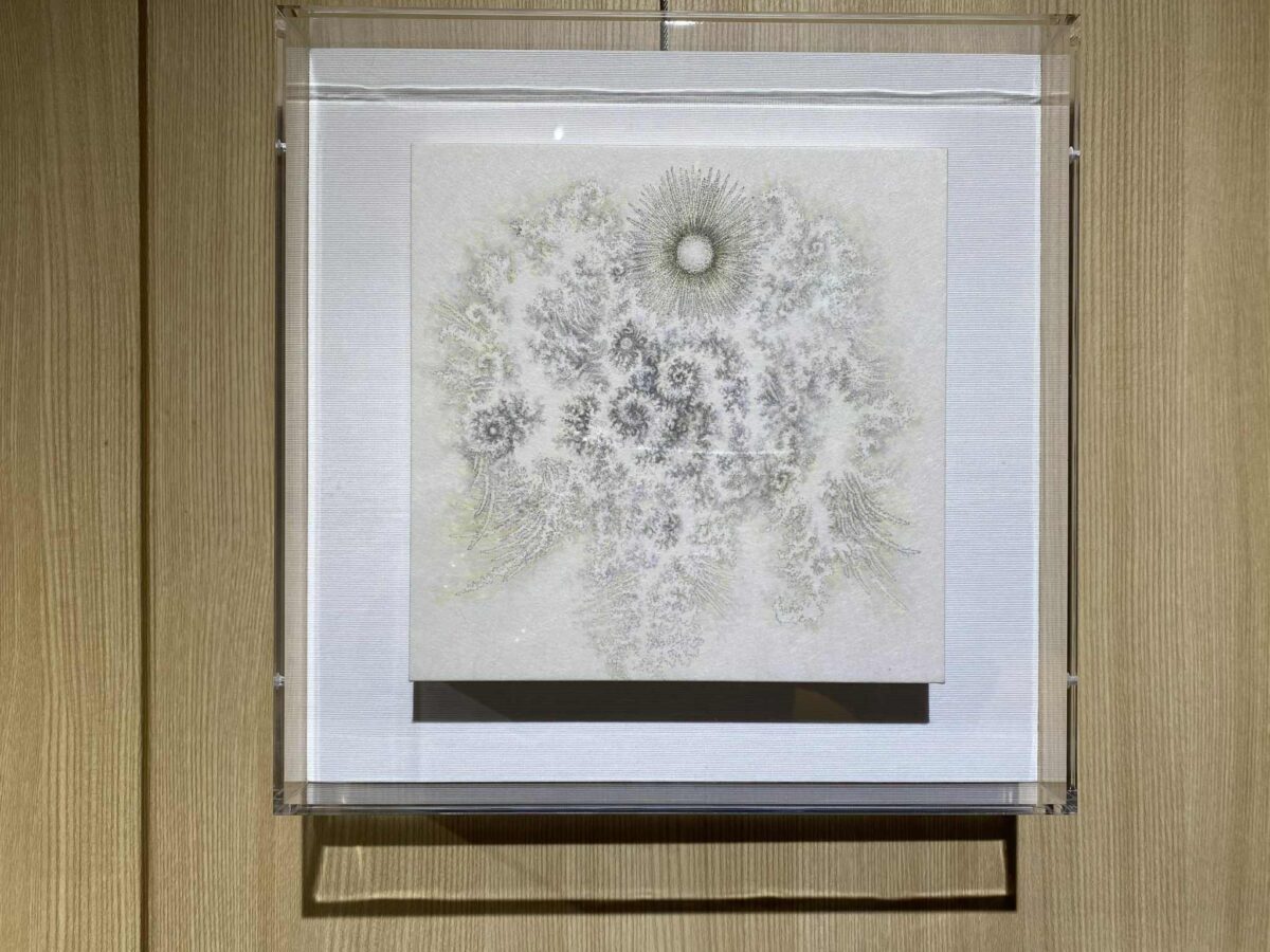 数点購入しているモノクロームの点描画にあわい色と光をまといはじめた新作が5点ほど展示されている。展示されてる壁に合わせて背景の素材を変えたりと配慮されてるのもさすがだと思う。
